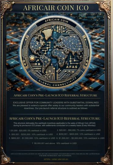 Leveraging blockchain's inherent security features, transactions with Africair Coin are tamper-proof and immutable, ensuring the highest levels of data integrity and trust. Africair Coin vision is to be a universally accepted currency across all Africair services, eliminating the complexities of currency exchange and fostering a truly global operational framework. By streamlining transaction processes and removing intermediaries, Africair Aviation Services significantly lowers transaction fees, benefiting both Africair and its clientele. Customers using Africair Coin will have access to exclusive rewards, discounts, and loyalty programs, further enhancing their travel and logistic experiences with Africair. "The introduction of the Africair Blockchain Coin is more than just an innovation; it's a strategic leap forward," said Jay Tolbert, CEO and Founder of Africair Aviation Services. "In today's digital era, embracing blockchain technology allows us to offer our customers and partners an unparalleled level of service and convenience.